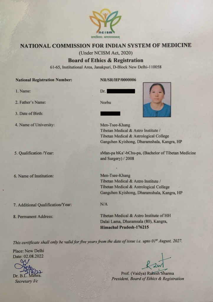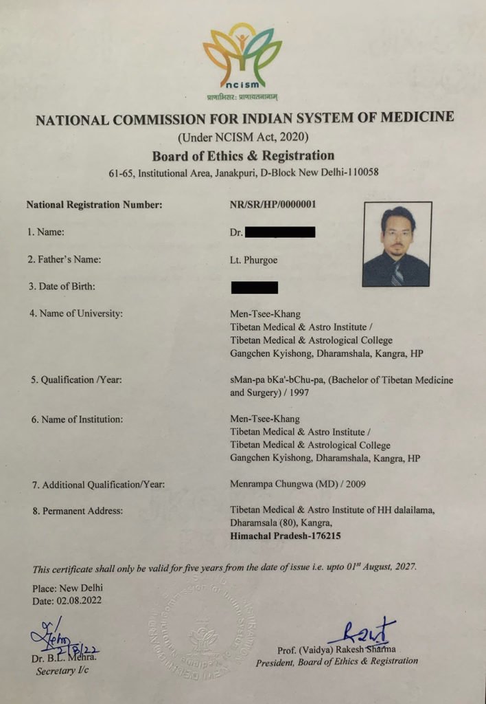 In accordance with his verbal consent to issue registration certificates to 54 doctors from Men-Tsee-Khang, Shri (Vaidya) Jayant Deopujari Ji, the Chairman of NCISM under the Ministry of AYUSH, issued registration certificates to 8 doctors on Wednesday, 3 August 2022. Similarly, on 8th of this month, the commission plans to issue certificates to the South-zone doctors. Thereafter, North and North-Eastern based doctors will be provided with certificates in a phase manner. Men-Tsee-Khang would like to convey its sincerest gratitude to the Honorable Chairman and Prof. (Vaidya) Rakesh Sharma Ji, the President of Board of Ethics and Registration, for extending their unwavering support and assistance in this regard.